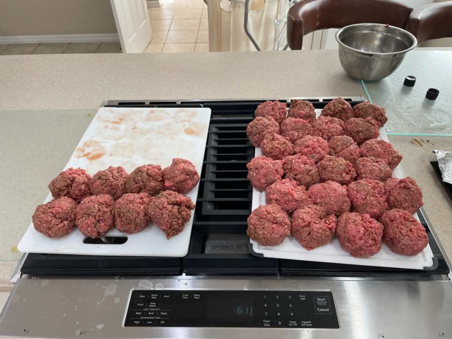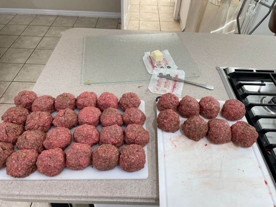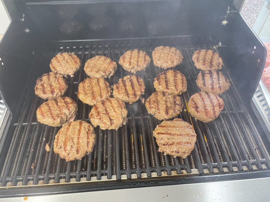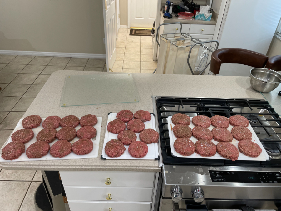 One of my most requested is my hamburger. It is quite simple and just as good as when it came off the grill. I start with 12 pounds of ground chuck (on sale) and add ¼ cup of Worcestershire per pound of ground chuck and let it sit for ten minutes. I do this in three bowls. I weigh the mixture and divide that by 32 to come up with a weight for each patty..