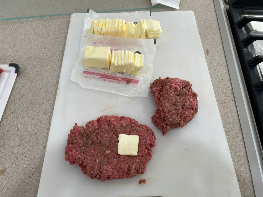 I then flatten each patty into roughly a rectangle and place one teaspoon of unsalted butter on one half