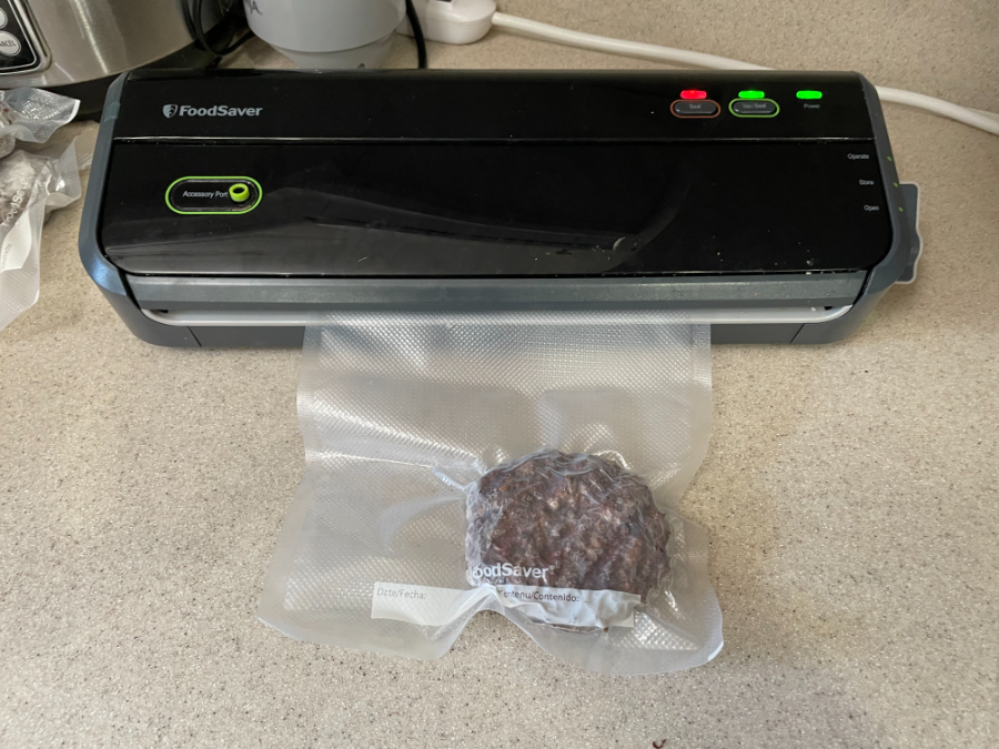I then place them on a cookie sheet with parchment paper between the layers and put them in the freezer. I also take Pepperidge Farm® Sweet Hawaiian Hamburger Buns, separate them and freeze them too. Once everything is frozen, I vacuum pack the patty and stick it and the bun in a zip lock freezer bag with a date and instructions label: ‘Toast the bun in a toaster and microwave the patty in the unopened bag for two minutes. I serve it with a little mayonnaise on the bun, air fryer french fries and homemade chocolate milk shakes. Happy Labor Day.